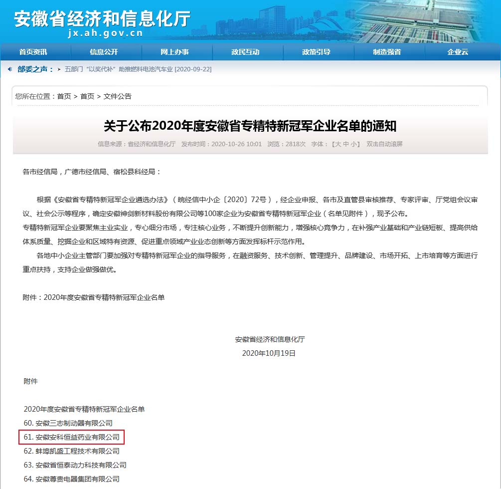 近日,安徽省經濟和信息化廳公布了 2020 年度安徽省專精特新冠軍企業名單,我公司入選安徽省專精特新冠軍企業。